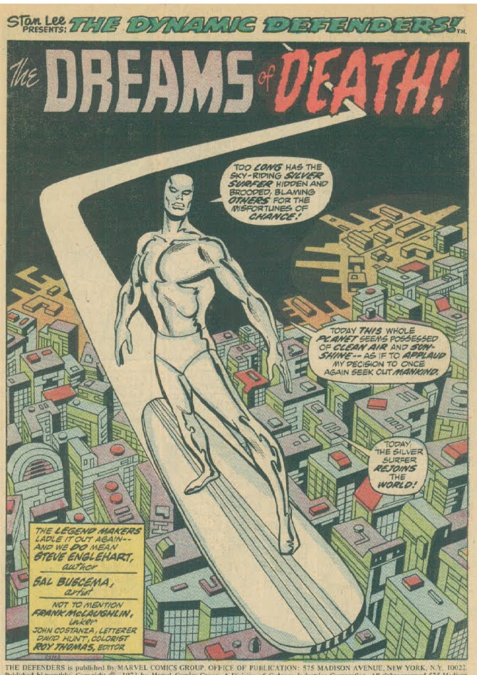 One of my favourite teams at the time was Marvels Defenders which had a rotating line-up from 1972 until 1986, with Dr. Strange and the Hulk usually being constant members along with a number of other mainstay characters that joined and then left the team at various points in the comics run. Although the first issue of the Defenders that I bought was issue 5 (a great fun comic in its own right ) it was with issue 6 “The Dreams of Death” which saw the reintroduction of the Silver Surfer to the group, that it became my favourite comic at the time. Defenders issue 6 was cover dated June 1973 and appeared in the UK around October/November. I still recall the day I visited my local newsagent in the town we stayed in at that time around November and saw a big pile of various US comics neatly stacked on the counter with Defenders issue 6 at the top. I had only purchased issue 5 a few weeks previous to this and loved it so this was a no brainer, I immediately purchased issue 6 and headed home to devour every page (at 13 years old you just didn't read comics). The story itself features the Silver Surfer returning to the Defenders to apologise for the way he acted the last time they were together.